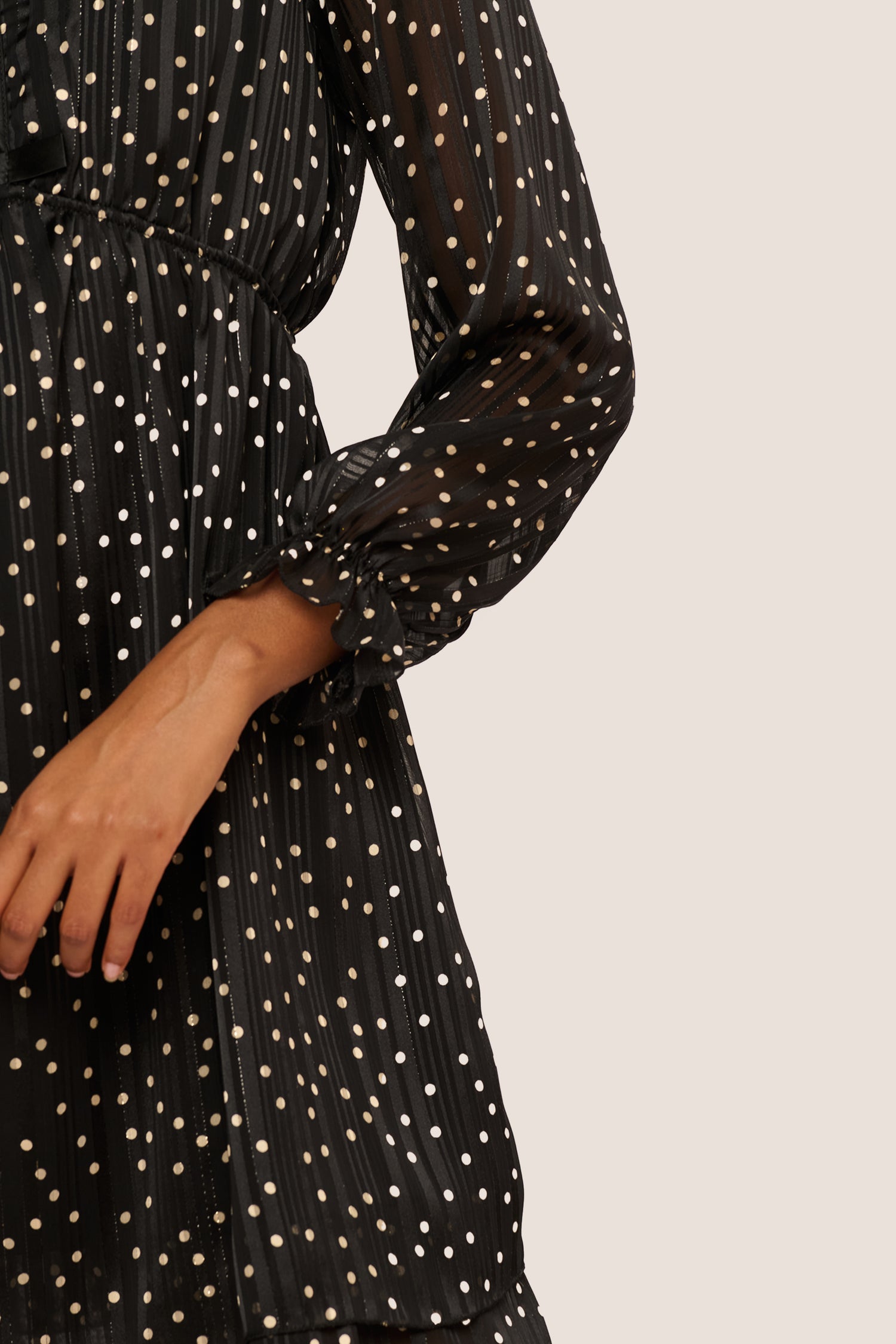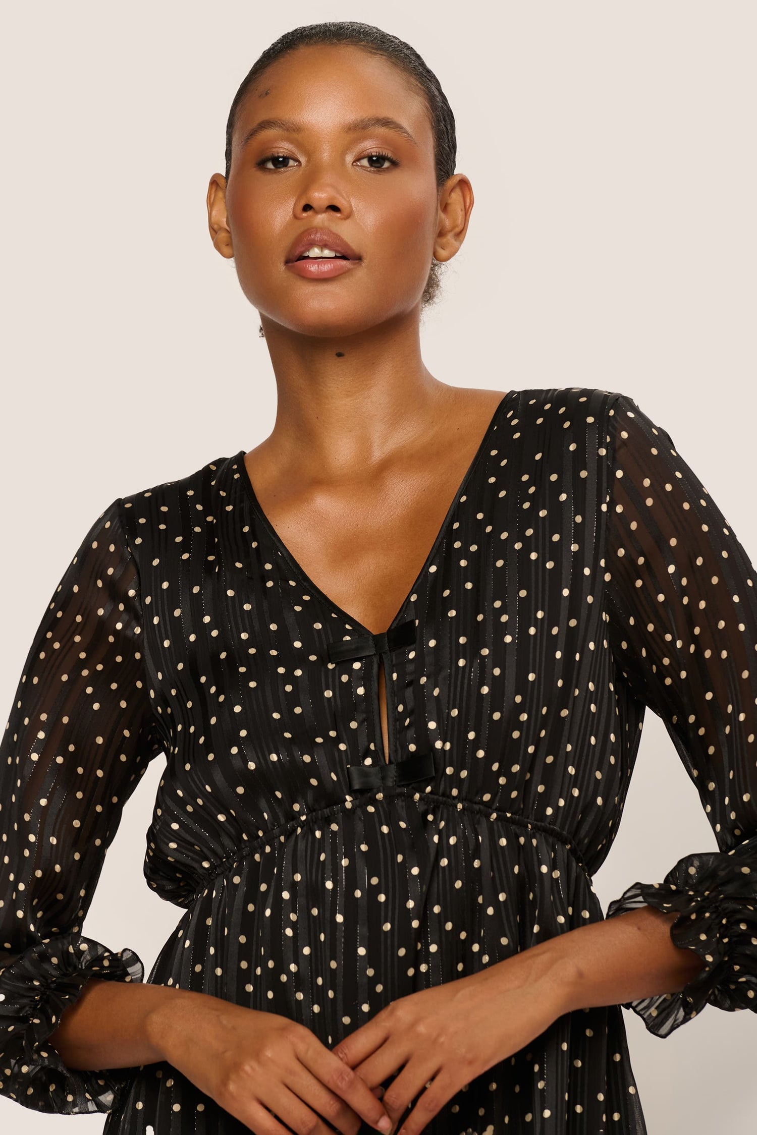 Mini dress in lurex-striped georgette featuring a golden polka dot print on a black background, a V-neck, decorative satin bows on the front, an elasticated waist and cuffs, and a flared skirt. This style is lined.