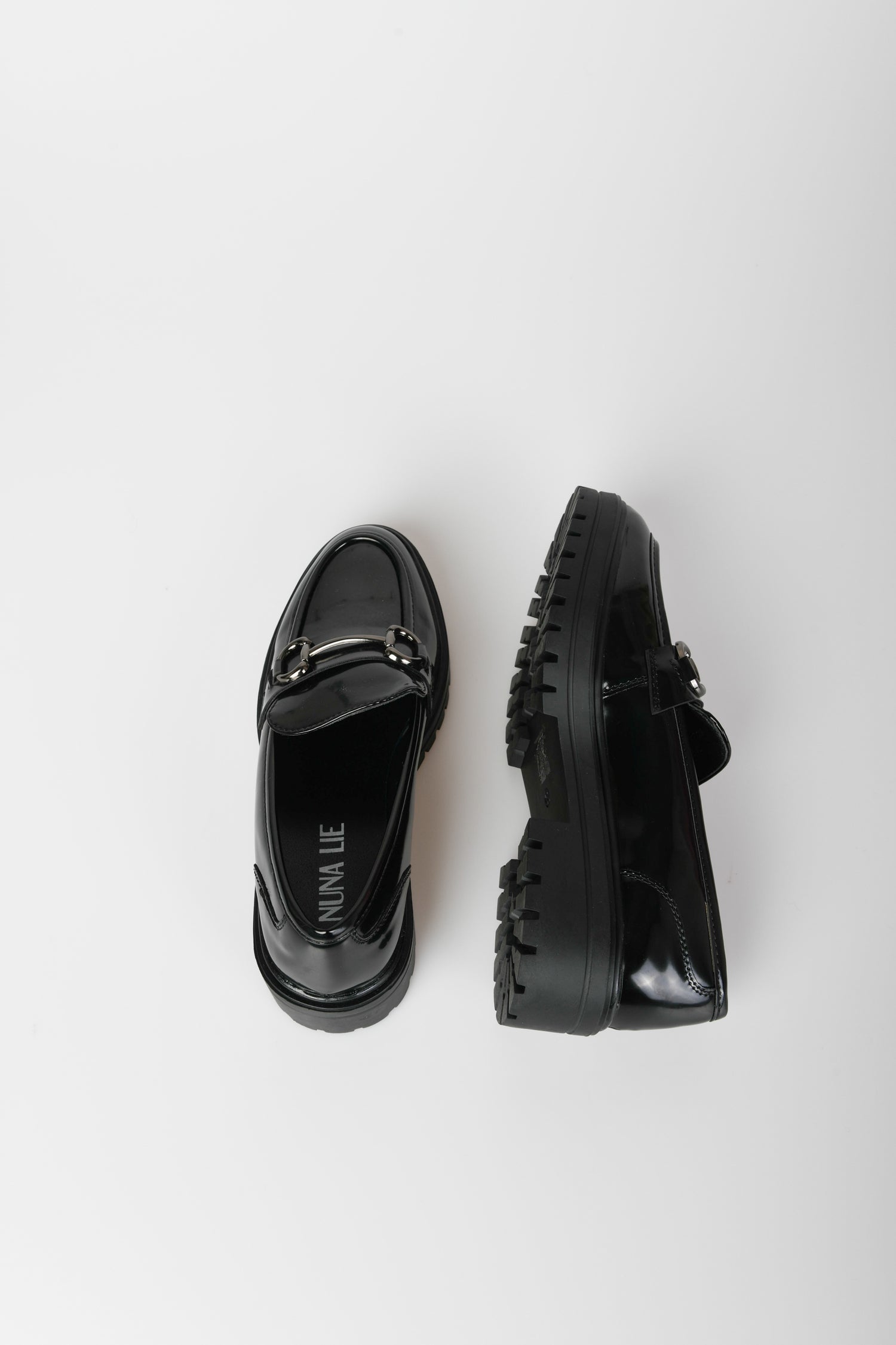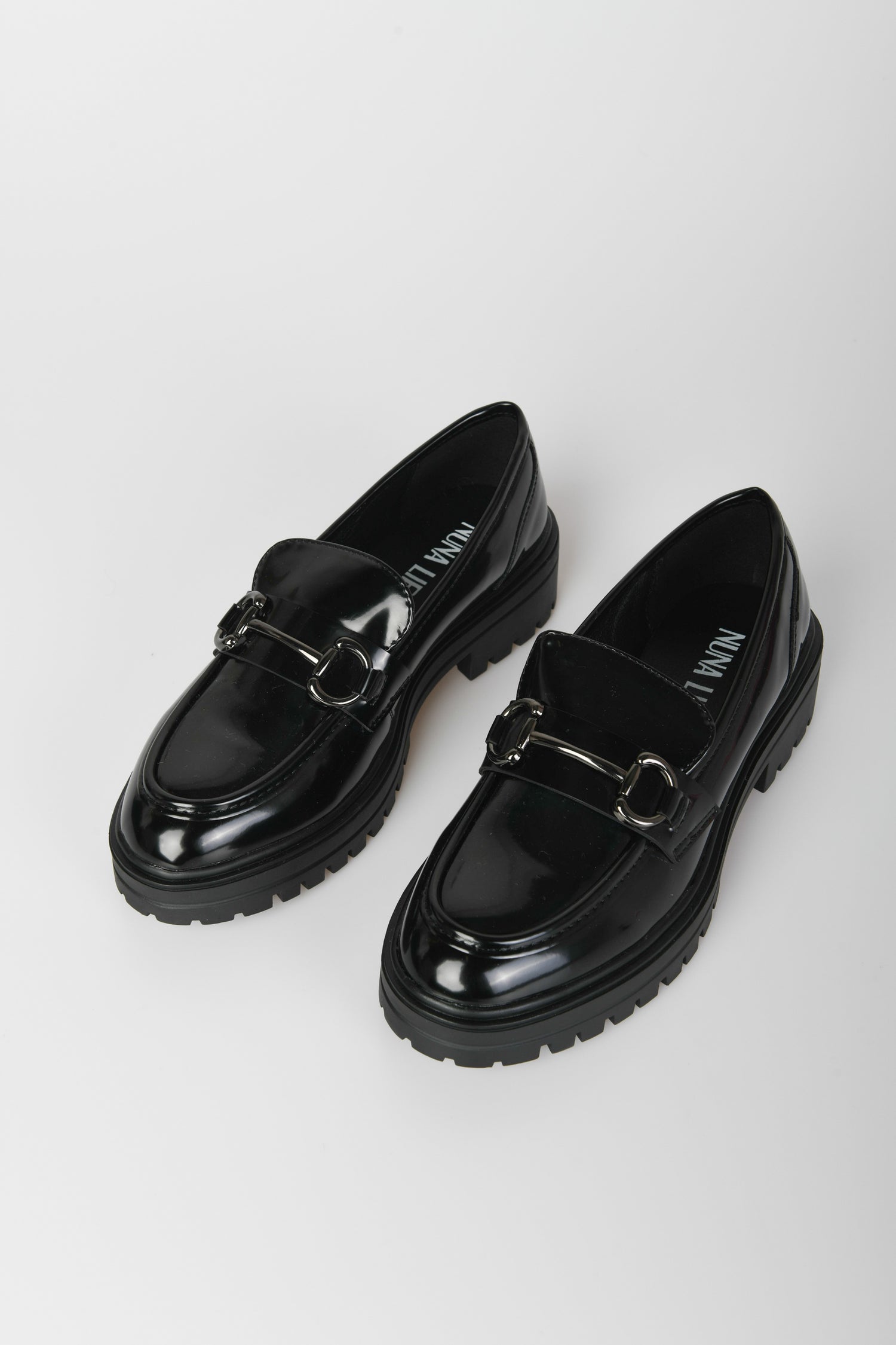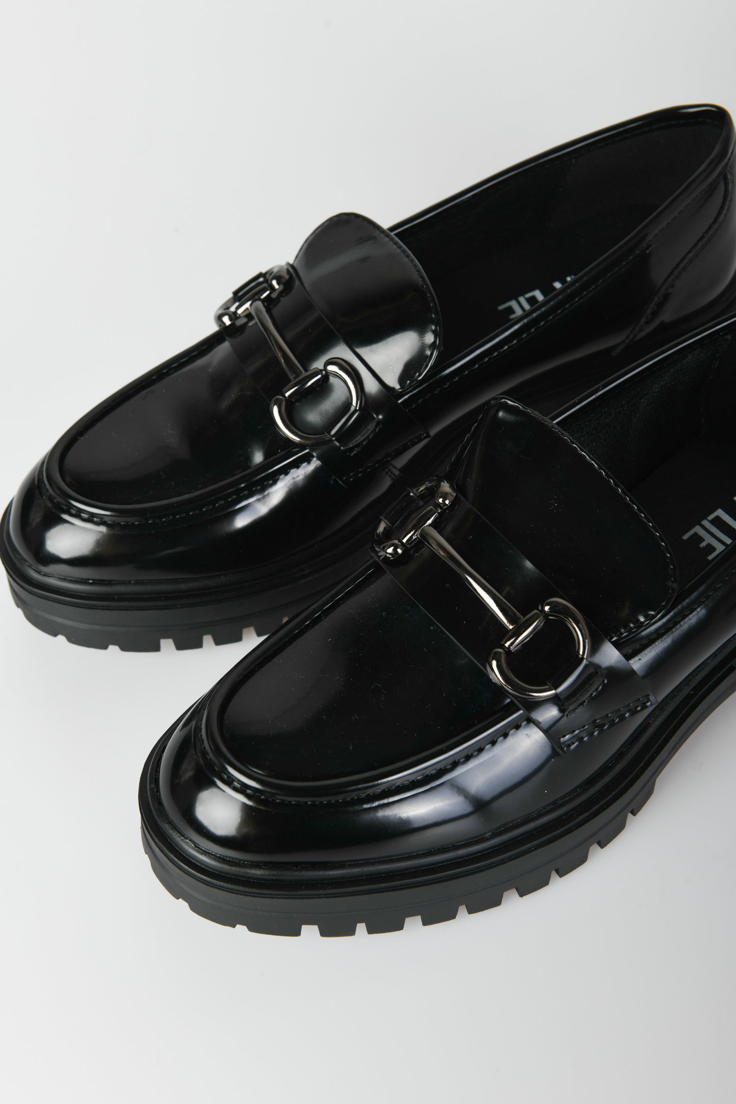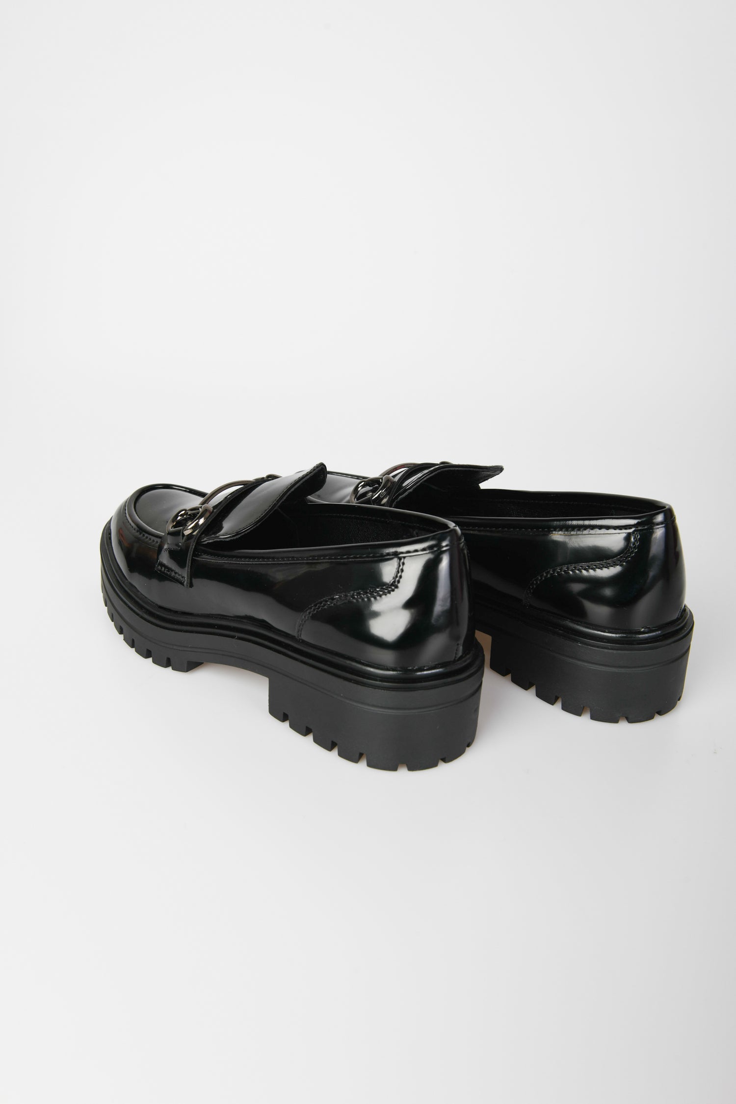 Black faux leather loafers featuring a rounded almond toe, silver-tone metal buckles on the front strap and chunky tread rubber sole.