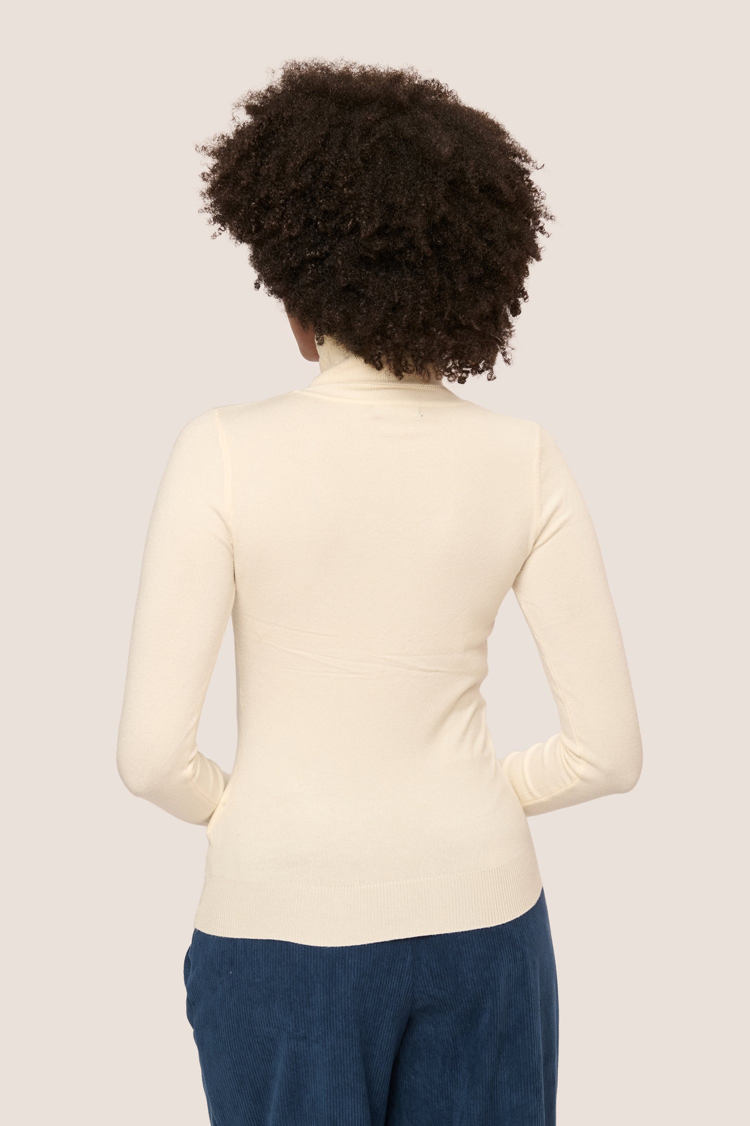 Ivory viscose blend knit turtleneck featuring ribbed edges, gold-tone buttons at the cuffs and a fitted silhouette.