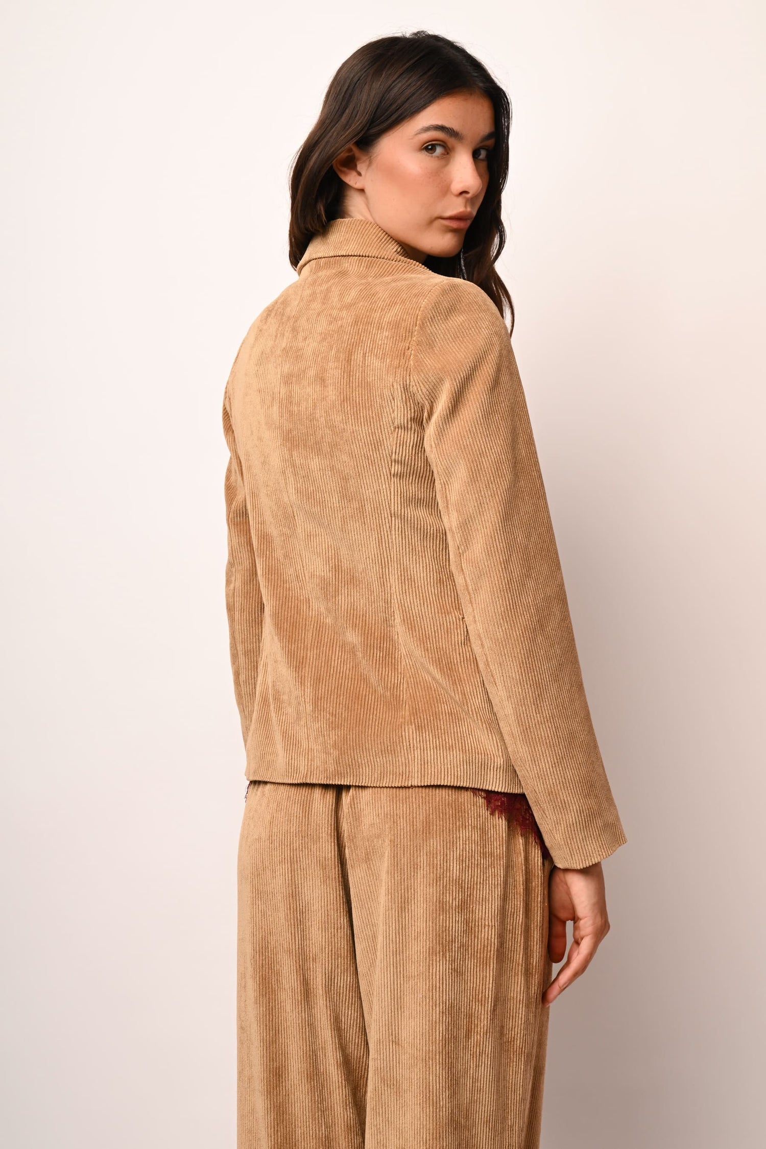 Beige corduroy single-breasted blazer featuring notched lapels, one button fastening and front welt pockets.