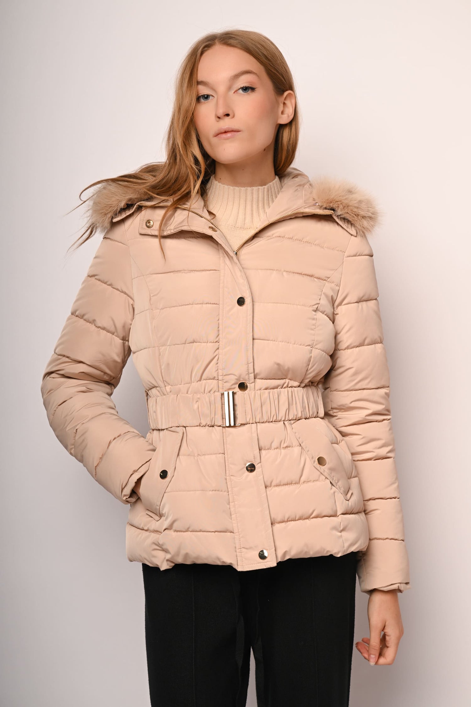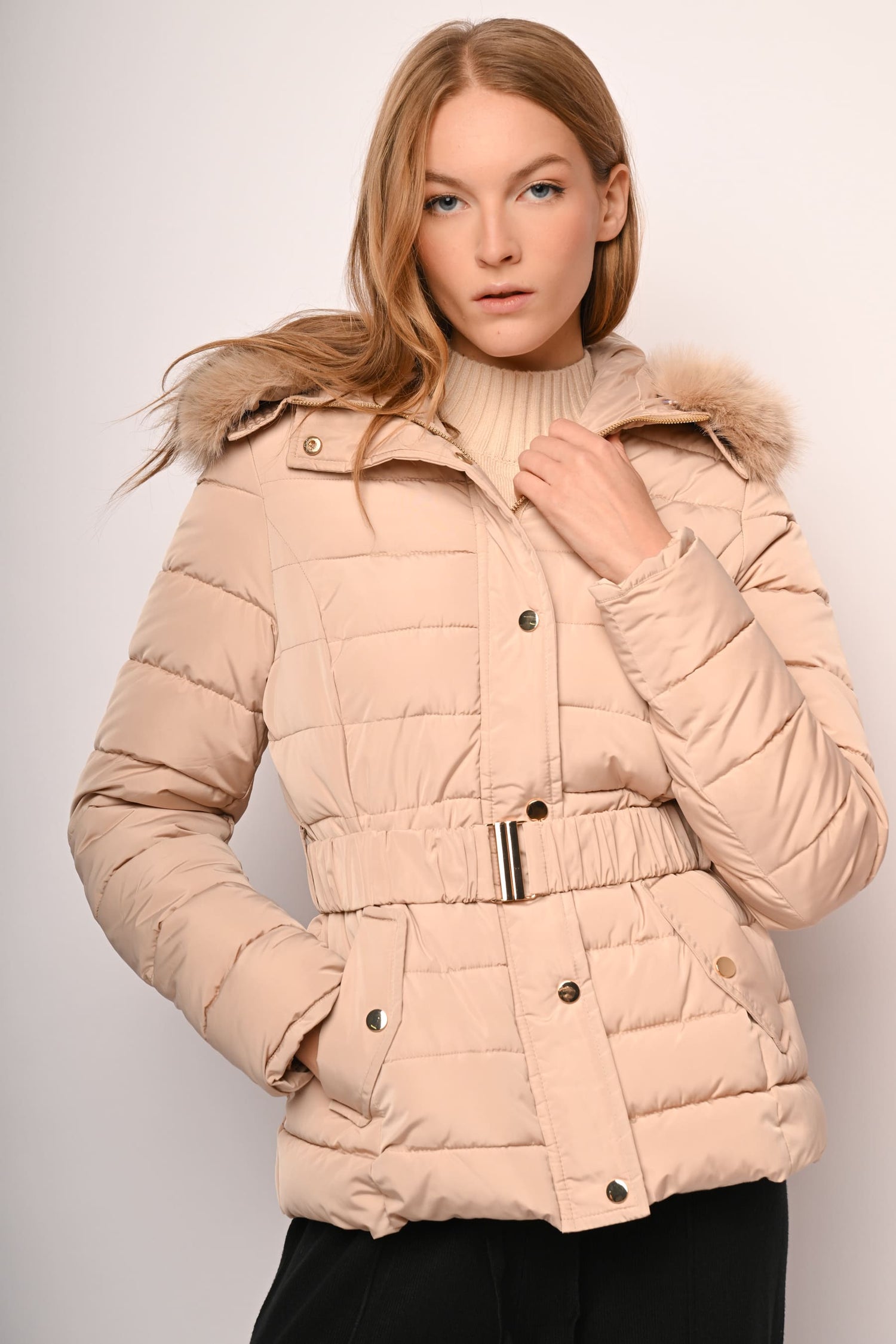 Faux fur trimmed hood short down jacket SKU B23KZJ109BE-25-AI25 BEIGE 100% polyester