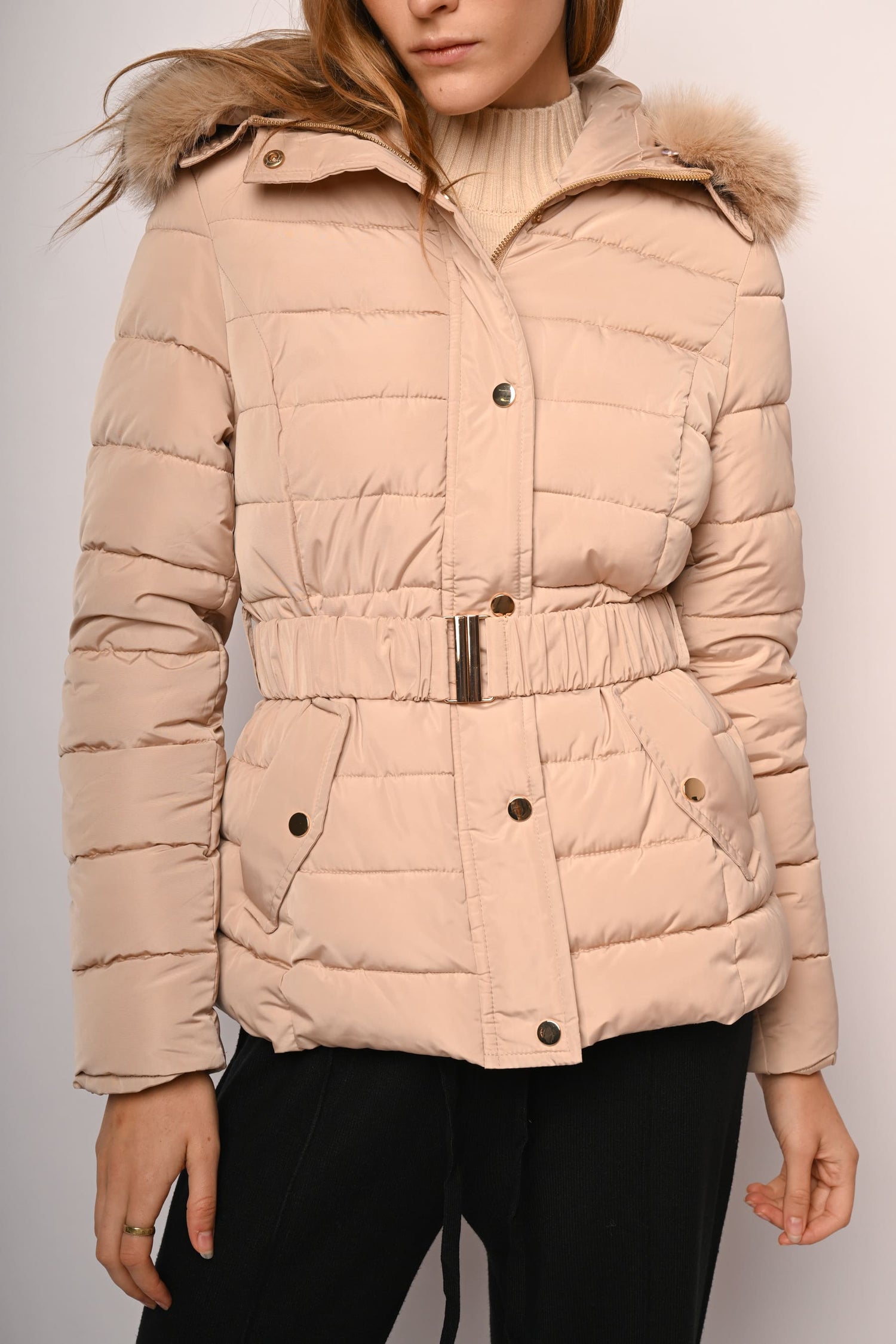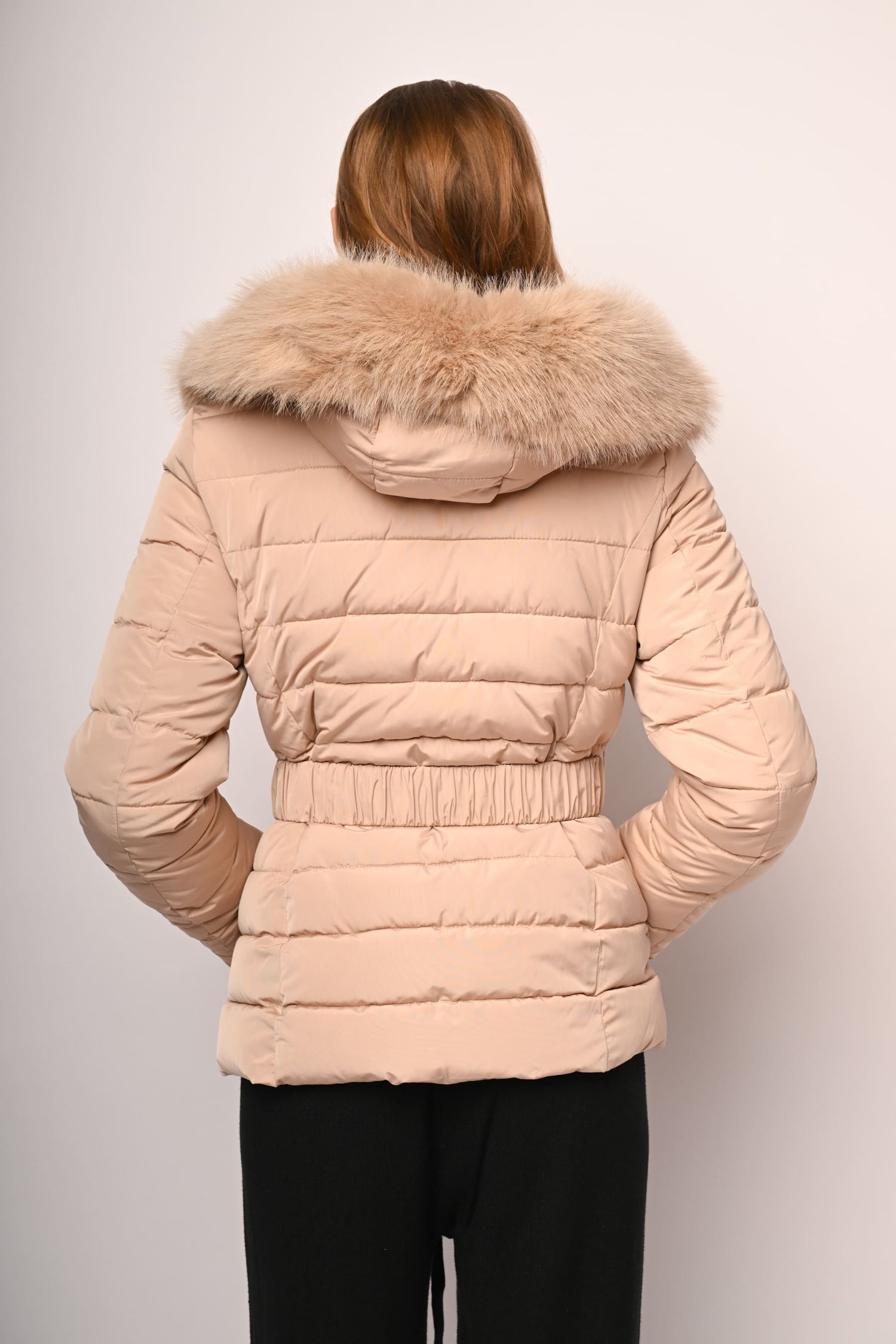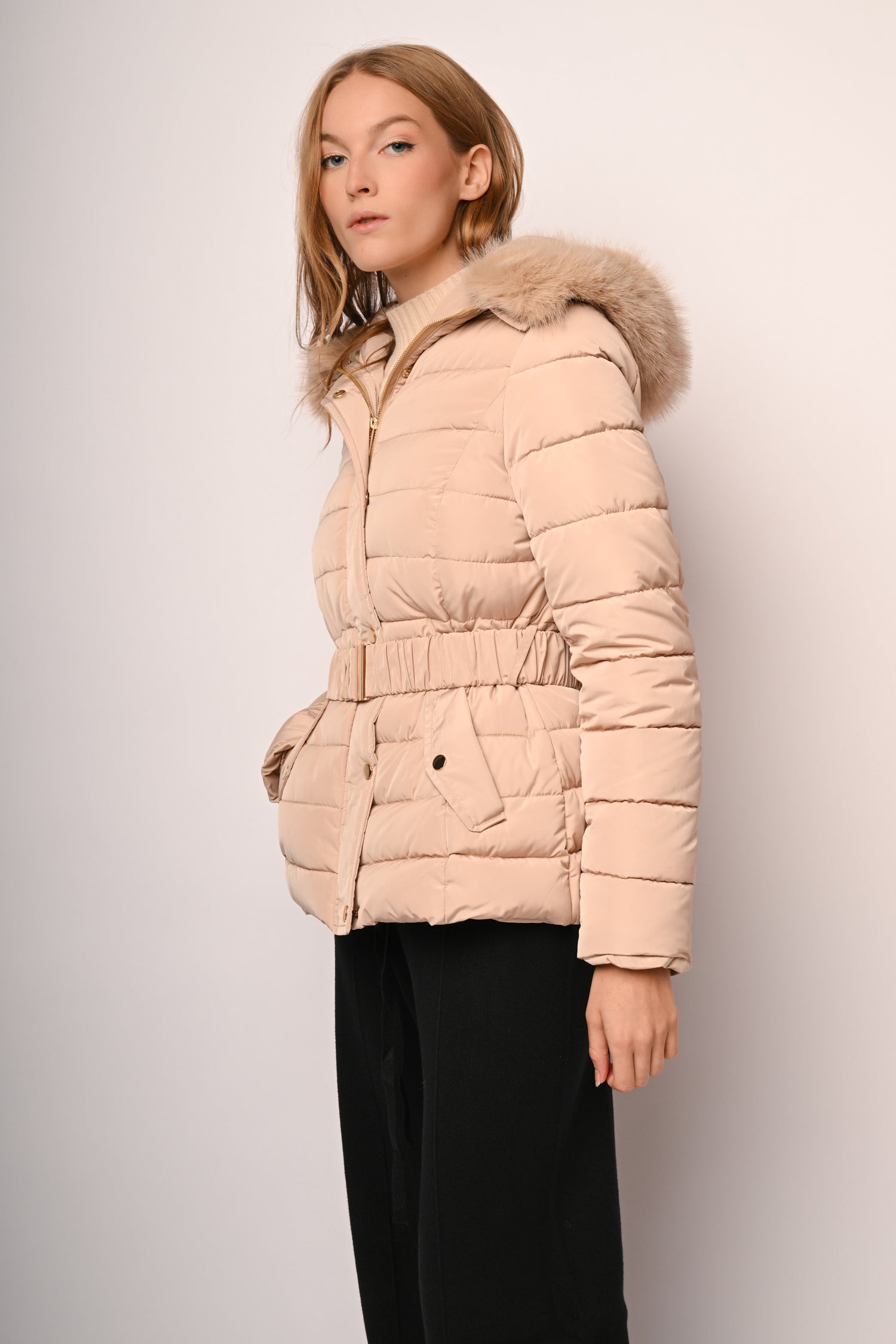 Short beige quilted and padded nylon down jacket featuring a faux fur-trimmed hood, high collar, front fastening with concealed zip and press studs, matching elasticated waistband and side pockets with button fastening.