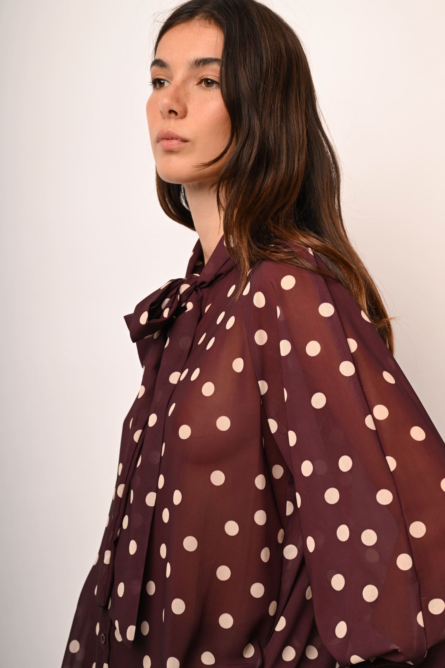 Blouse featuring ivory polka dot print on a burgundy background, pussy bow neck, raglan blouson sleeves, buttoned cuffs and rounded hem.