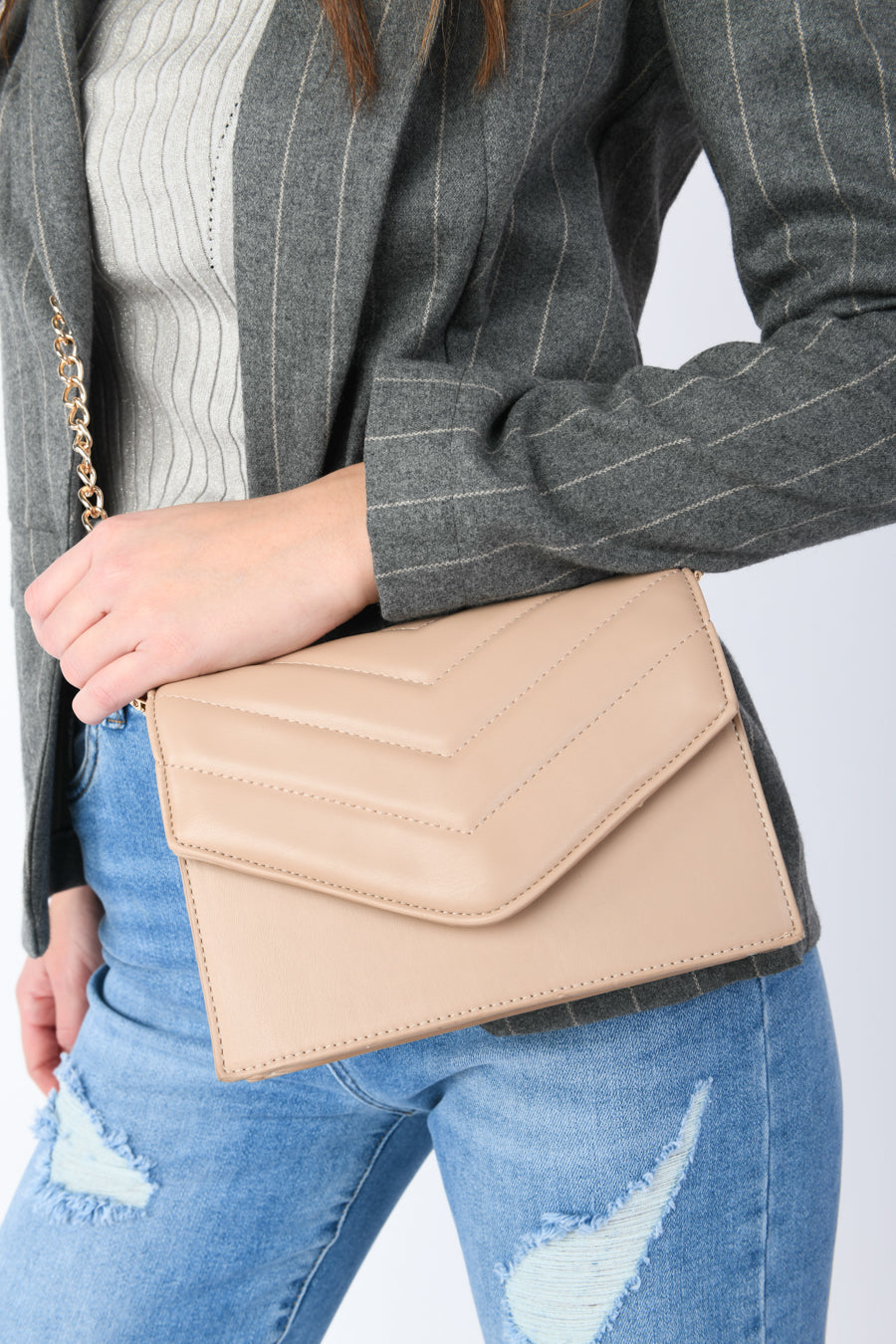 Beige faux leather bag featuring quilted V-shaped flap, detachable gold-tone metal chain shoulder strap and concealed magnetic fastening.