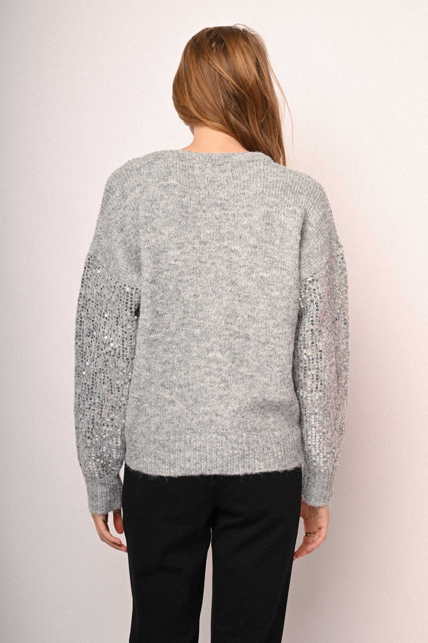 Heather light grey viscose blend sweater featuring a crew neck, dropped shoulders, ribbed edges and sequin embellishment on the front and sleeves.
