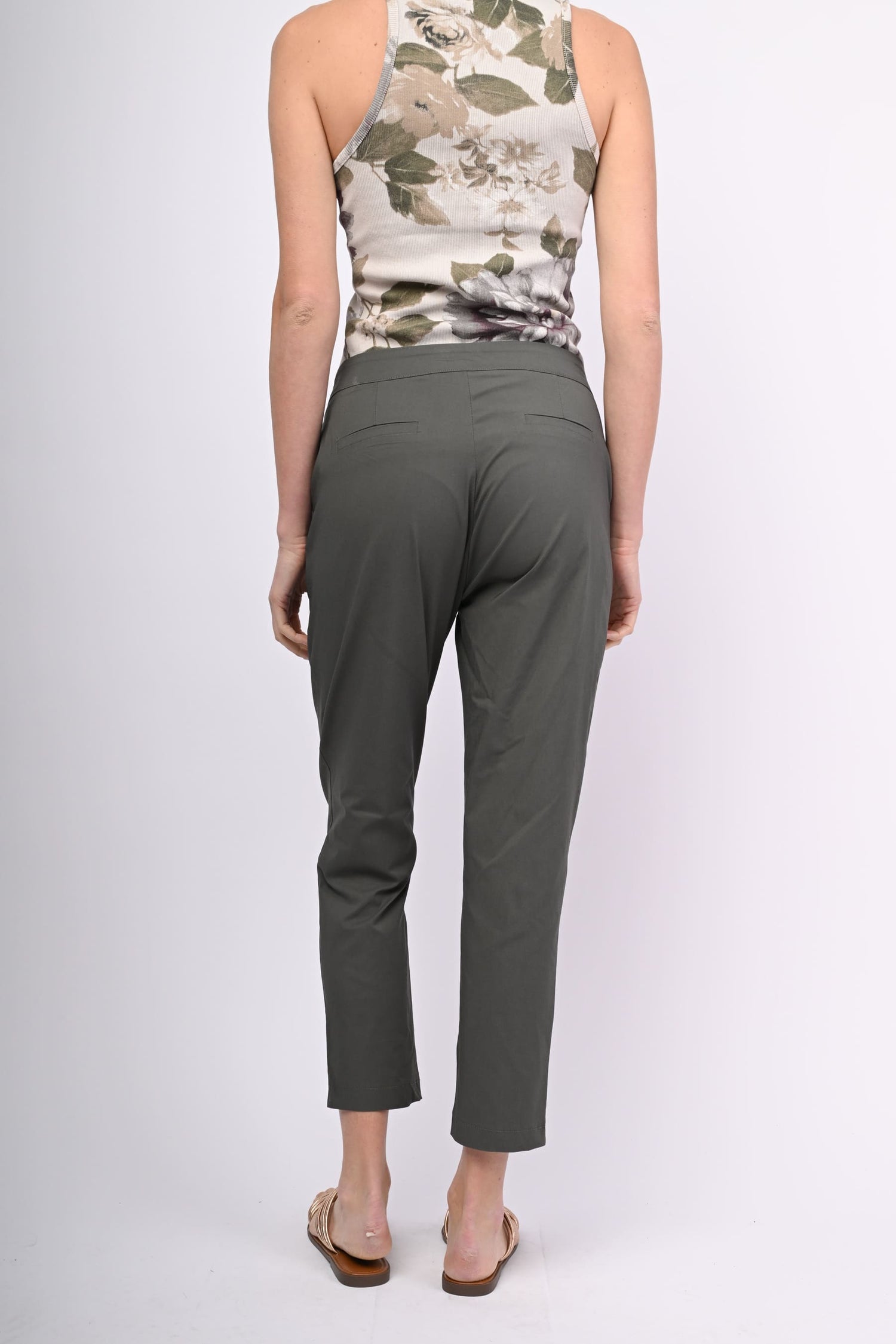 Military green stretch viscose blend cigarette trousers featuring button and concealed zip fastening, side pockets and rear welt pockets.