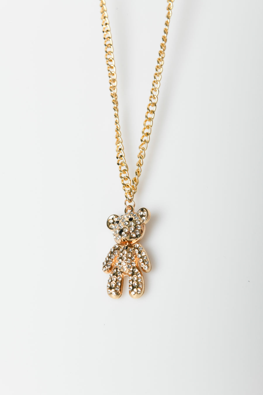 Gold-tone metal chain necklace with teddy bear pendant embellished with rhinestones.